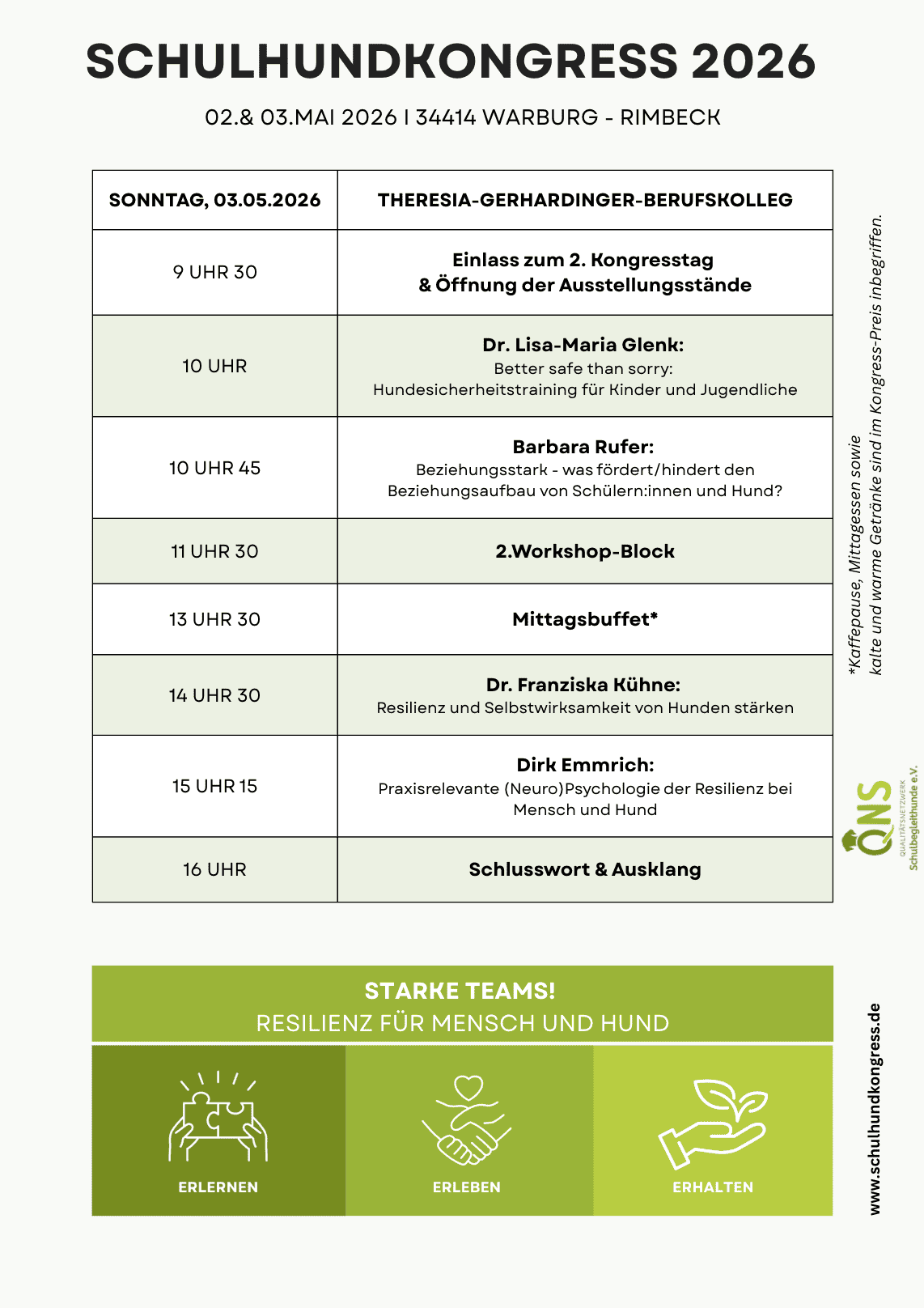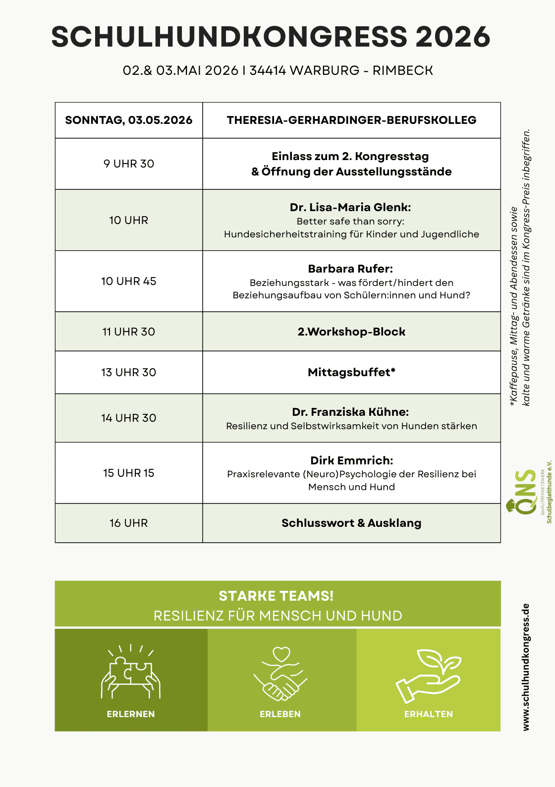 Der zeitliche Rahmen des Schulhundkongresses steht bereits fest. Die konkreten zeitlichen Zuordnungen, also wann welche Vorträge stattfinden, werden Mitte März 2026 bekannt gegeben.
