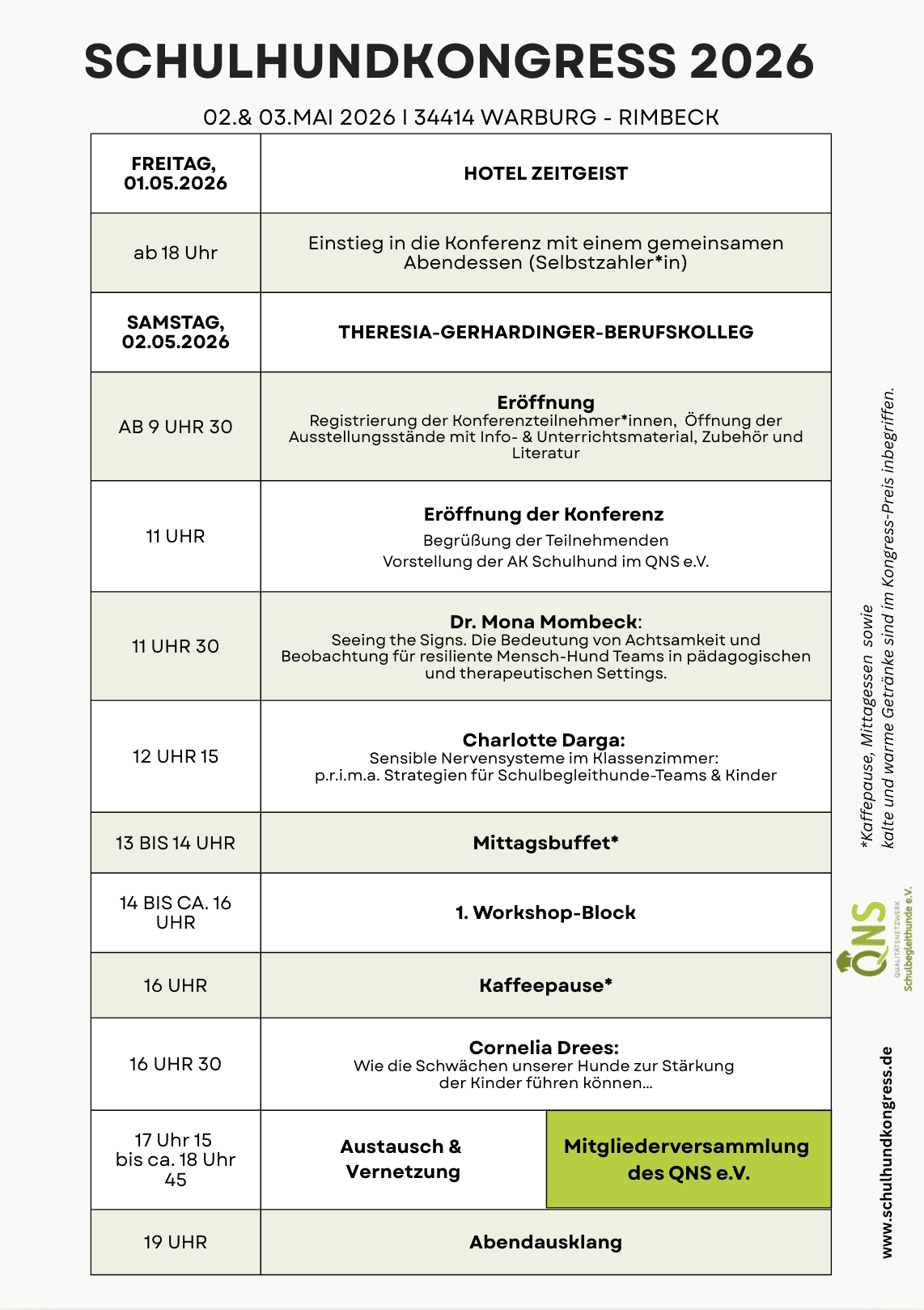 Der Schulhundkongress 2026 beginnt am Samstag, den 02. Mai um 09:30 und geht bis ca. 18:00 Uhr. Im Anschluss findet die Mitgliederversammlung des QNS e.V. statt und danach klingt der Abend mit einem gemeinsamen Buffet aus.